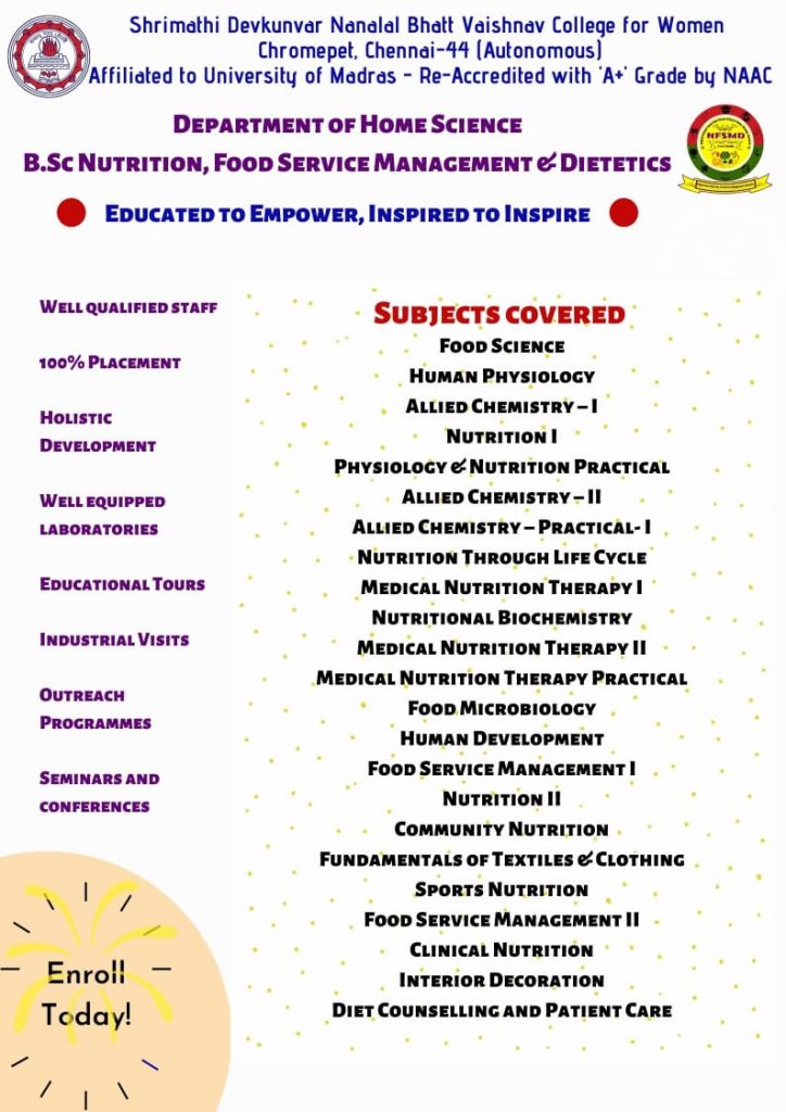 The Department of NFSMD aims to provide a holistic learning atmosphere to educate young women so that they gain self-reliance, social relevance, sound value system by which they can be inspired to inspire.