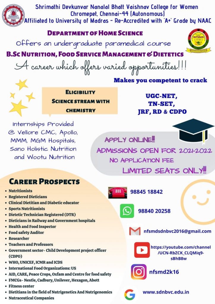 Jayshree Sahu(Batch of 2017): At SDNB Vaishnav College for Women, The Department of Home science, amidst state of the highly intellectual and supportive faculties. The food science lab, microbiology lab, the physiology lab and the research lab are highly equipped with supportive assistants. It was a really good experience and was indeed a friendly environment to interact with the teachers. So, as an alumnus, I would really like to thank the entire department of Home science for the holistic learning experience.