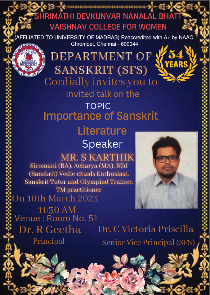 Department of Sanskrit was started in the year 1984 in the Self – Finance stream . Since then the Department has offered Part- I Sanskrit to the College students. SANSKRIT being the ancient language , has it’s own cultural heritage and treasure of knowledge . Department of Sanskrit introduces the Language to the students from it’s basics. Classical works of great poets are taught thus enabling students to enjoy the aesthetics of this Language. Along with this an introduction to Ayurveda is also given to the students in their syllabus ‘Vaidyakiya Subhashita Sahityam’ .Central Government has decided to promote , propagate and uplift the use of Sanskrit throughout the Nation. Our College as an institution of Education has already strived hard towards this goal .