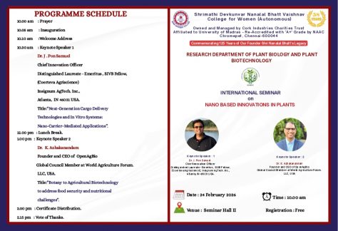 Shrimathi Devkunvar Nanalal Bhatt Vaishnav College for Women was started in 1968 with the generous donation of 10 acres of land by our Late Founder Chairman Shri Nanalal Bhatt and 6 lakhs donated by Cork Industries Charities Trust. The College is named after the Late Founder Chairman’s wife Smt. Devkunvar. This college is the first women’s college in Kancheepuram District, Tamil Nadu. The present Chairman Smt. Mamta D. Bhatt is a dynamic and energetic leader with innovative ideas and with the potential of executing them precisely. The College Secretary,