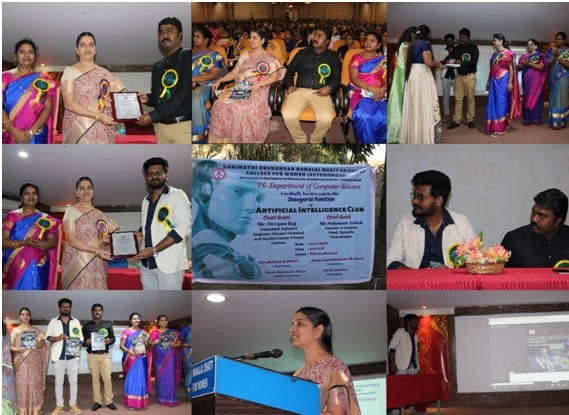 The PG-Department of Computer Science initiated the AI Club in SDNB Vaishnav College for Women and it was inaugurated by Chief Guests Mr.Deepan Raj (Visteon Technical & Service Center Pvt. Ltd.) &Mr.Solomon Ashok (Splendio Technologies) on 29/1/2020.The Principal and Organizing committee were present during the inauguration. The Newsletter & URL link (http://online.fliphtml5.com/viyro/nkac/) of the AI club was released by our Chief Guests.They delivered speech based on the Former President of India APJ.AbdulKalam’s mission for 2020 and the AI training program in various areas conducted in society. Around 500+ students from various disciplines of our college have joined the AI club. The objective of this club is to create awareness and equip the students with the ability as well as skill to analyze, understand the technology in the field of Artificial Intelligence. This Quarterly Newsletter will bring out articles, posters of recent technologies related to AI by students from various disciplines.