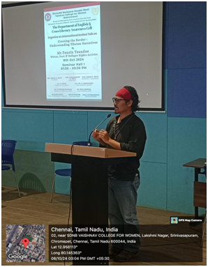 On October 8, 2024, the Seminar Hall I at SDNB Vaishnav College for Women in Chennai hosted an enlightening International Invited Talk by Tenzin Tsundue, titled “Crossing the Border: Understanding Tibetan Narratives.” The session, held from 1:30 pm to 3:30 pm, offered a profound insight into the ongoing refugee situation and the broader socio-political issues surrounding Tibet.