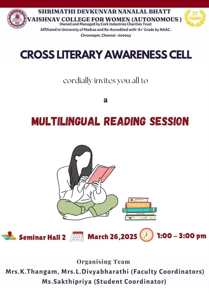 On 26th March 2025, the Cross-Literary Awareness Cell organized a Multilingual Reading Session for the club members. The organizer took the opportunity to introduce the Cross-Literary Awareness Cell, emphasizing its crucial role in promoting a diverse range of literary expressions across various languages. The cell’s work in fostering cross-cultural understanding through literature was highlighted, illustrating its significance in broadening perspectives and celebrating the richness of global literary traditions.