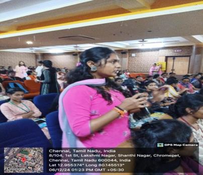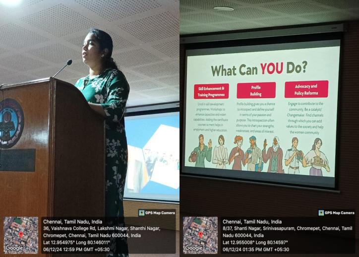 The Women Rights Forum Club organized an event on Breaking Barriers: Advancing Women’s Rights and Opportunities on December 06, 2024 at Mini Auditorium with the presence of President Ms. S. Gajalakshmi and Vice-President Ms. Durga R. A was delivered a Guest Lecture by the Resource Person Ms. Shri Jhanani SP. The programme started with prayer song followed by the welcome speech included Fashion Walk, Dance, Self Defence were presented by club students ended with National Anthem.