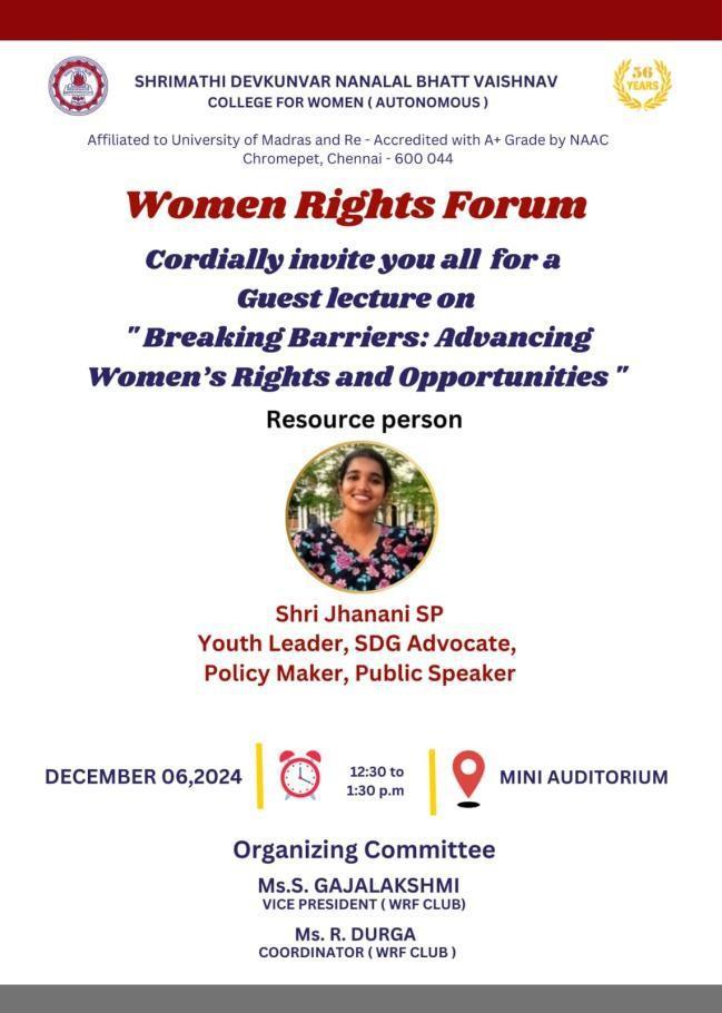 The Women Rights Forum Club organized an event on Breaking Barriers: Advancing Women’s Rights and Opportunities on December 06, 2024 at Mini Auditorium with the presence of President Ms. S. Gajalakshmi and Vice-President Ms. Durga R. was delivered a Guest Lecture by the Resource Person Ms. Shri Jhanani SP. The programme started with prayer song followed by the welcome speech, interative sessions with students, and inspirational video for students.