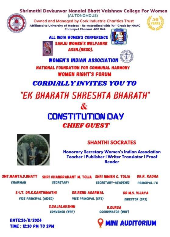 The Women Rights Forum Club organized an event for the celebration of Constitution Day and the commemoration of ‘Ek Bharat Shreshtha Bharat’ on November 26, 2024 at Mini Auditorium with the presence of Convenor Ms. S. Gajalakshmi and Coordinator Ms. Durga R. A talk on ‘Constitutional Rights for Women’ was delivered by the Resource Person Mrs. Shanthi Socrates. The programme started with prayer song followed by the welcome speech included Fashion Walk, Dance, Self Defence were presented by club students ended with National Anthem.