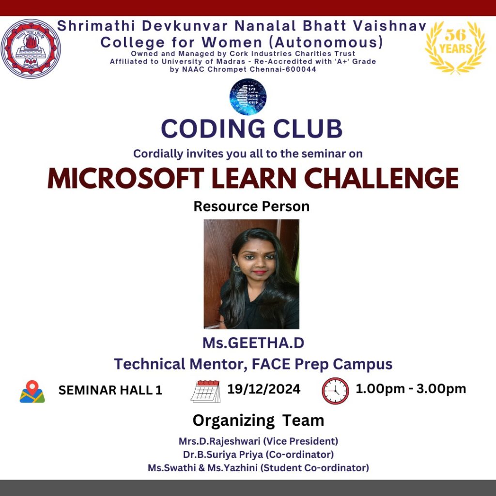 The Coding Club held a seminar on 19-12-24, at 1.00 pm in the Seminar Hall 1, with Ms.Geetha.D, are source person and Technicalment or at FACE Prep.The students had an engaging educational orientation. It featured thorough rundown of how to use Microsoft Courses.