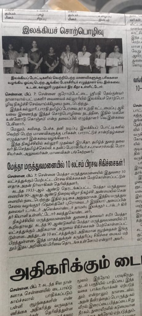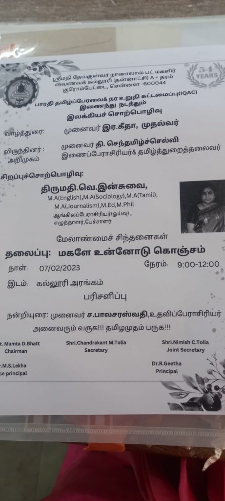 - Special lectures and seminars are conducted by eminent personalities on Tamil literature