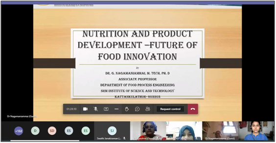 To integrate the realms of food product development in production of novel nutritious food products, an inquisitive guest lecture on ‘NUTRITION AND PRODUCT DEVELOPMENT -FUTURE OF FOOD INNOVATION’ was organized on 21 st March 2021, by inviting the eminent speaker, Dr. G. Nagamaniammai, M.Tech, Ph.D., Associate Professor, Food Process Engineering, SRM Institute of Science and Technology. The speaker imparted knowledge on various aspects of NPD like food product innovations, future of food trends, nutraceutical, functional foods, categories and need for process food, stages in developing new product, food perception model, scope of entrepreneurship in processed food, etc. Nearly 212 participants got benefitted by the updated insights on NPD through the virtual talk.