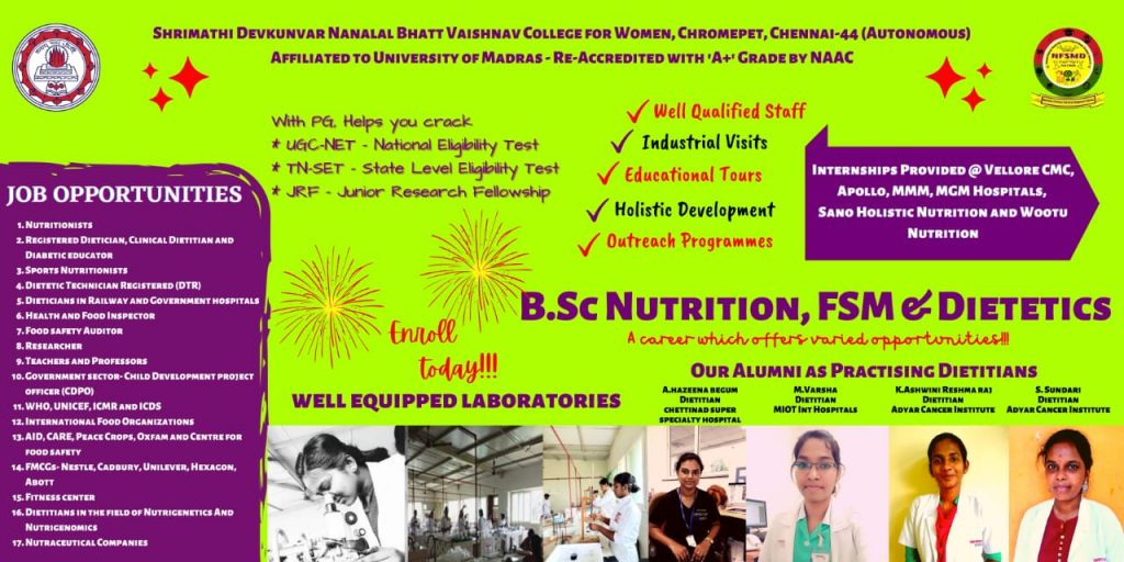 Jayshree Sahu(Batch of 2017): At SDNB Vaishnav College for Women, The Department of Home science, amidst state of the highly intellectual and supportive faculties. The food science lab, microbiology lab, the physiology lab and the research lab are highly equipped with supportive assistants. It was a really good experience and was indeed a friendly environment to interact with the teachers. So, as an alumnus, I would really like to thank the entire department of Home science for the holistic learning experience.