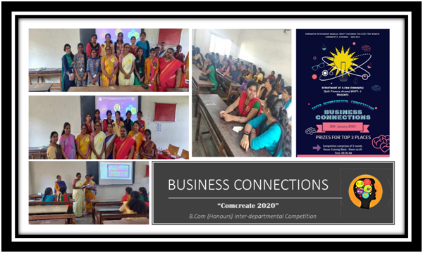 The Inter-departmental Competition “BUSINESS CONNECTIONS”was conducted on 20th January 2020 in Room No:45, evening block. The competition consisted of different pictures depicting commerce terms and industrial brands to test the knowledge and awareness among the students of various UG streams. It consisted of three rounds namely “4 pics 1 word”, “Guess the Terms”& Decide the Champ??. The chief guests of the event Dr.D.LALITHA, Associate Professor, M.Com Department & Mrs. V.SUBASSHINI, Head In-charge, B.Sc Clinical Nutrition & Diet judged and announced the Prize winners of the event. I Prize – WajidhaBegum.E &Aksharaa.N.S [B.COM (General) II year C batch]: II Prize– Pavithra.B.V & Varsha.M [B.COM (General) I year D batch]: III Prize– Shruthi.S & Renga Padma [B.COM (Professional Accounting) I year] have been declared by the judges of the event.
