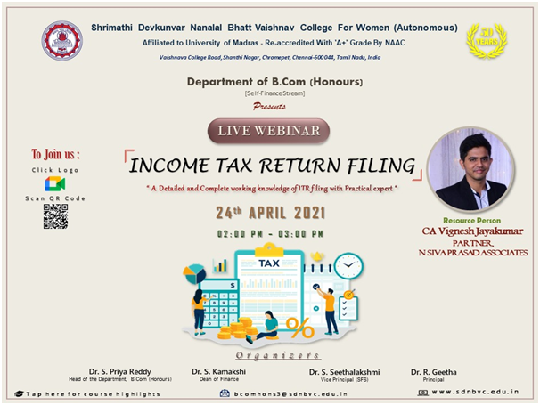 On 24thApril 2021, the Department of B.Com (Honours)(Self-Finance Stream) conducted a Webinar on the topic- “INCOME TAX RETURN FILING” by Mr. J.Vignesh, B.Com., ACA., through online mode. Students from I, II &III years actively participated and learnt to file an Income Tax Return, and benefited.