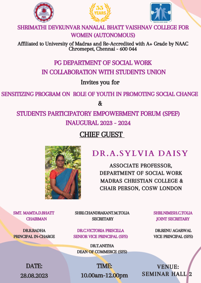 SENSITIZING PROGRAM ON ROLE OF YOUTH IN PROMOTING SOCIAL CHANGE & STUDENTS PARTICIPATORY EMPOWERMENT FORUM (SPEF) SPEF + Add to Google Calendar + iCal export