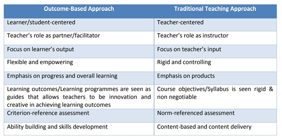 Outcome based education is seen a paradigm shift in the higher education that is student focused and outcome orientated. The table below provides a comparison of the traditional teaching approach and the outcome-based approach.
