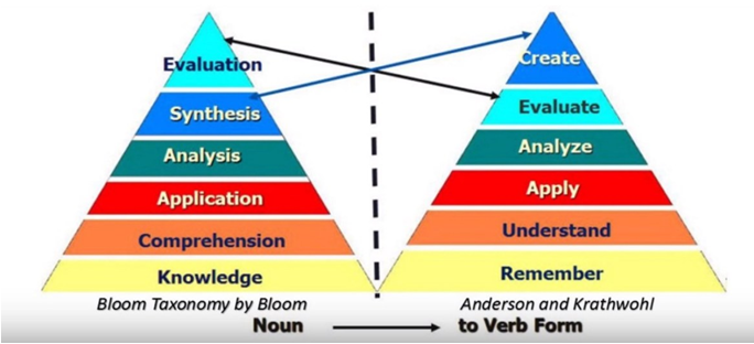 Bloom’s Taxonomy provides an important framework to not only design curriculum and teaching methodologies but also to design appropriate examination questions belonging to various cognitive levels. Bloom’s Taxonomy of Educational Objectives developed in 1956 by Benjamin Bloom was widely accepted by educators for curriculum design and assessment. In 2001, Anderson and Krathwohl modified Bloom’s Taxonomy to make it relevant to the present-day requirements. It attempts to divide learning into three types of domains (cognitive, affective, and behavioural) and then defines the level of performance for each domain. Conscious efforts to map the curriculum and assessment to these levels can help the programs to aim for higher-level abilities which go beyond remembering or understanding, and require application, analysis, evaluation or creation. Revised Bloom’s taxonomy in the cognitive domain includes thinking, knowledge, and application of knowledge. It is a popular framework in education to structure the assessment as it characterizes complexity and higher-order abilities. It identifies six levels of competencies within the cognitive domain as shown below which are appropriate for the purposes of educators.