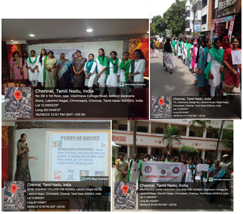 The NSS club of SDNB Vaishnav college for women organized the program regarding International Day against Drug abuse and Illicit Trafficking which was held on 26/06/2023. It was inaugurated by our honourable chief guest Dr.Gayathri BDS . In the event, she educated us the impacts of drugs . Followed by the event, NSS Volunteers of our College went on a rally with the help of Tamilnadu Police department creating an awareness among public on account of INTERNATIONAL DAY AGAINST DRUG ABUSE AND ILLICIT TRAFFICKING.