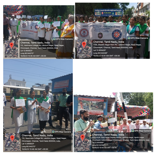 The NSS club of SDNB Vaishnav college for women organized the program regarding International Level Crossing Awarenss Day in association along with Sounthern Railway, Safety Department, Chennai Division .which was held on 05/06/2023. It was inaugurated in association with Balamurali.M Divisional safety Office . Our NSS unit went for safety campaign at Chromepet by creating awareness to the public about Railway Level Crossing. NSS Volunteers of our College had done an active participation on account of INTERNATIONAL LEVEL CROSSING AWARENESS DAY