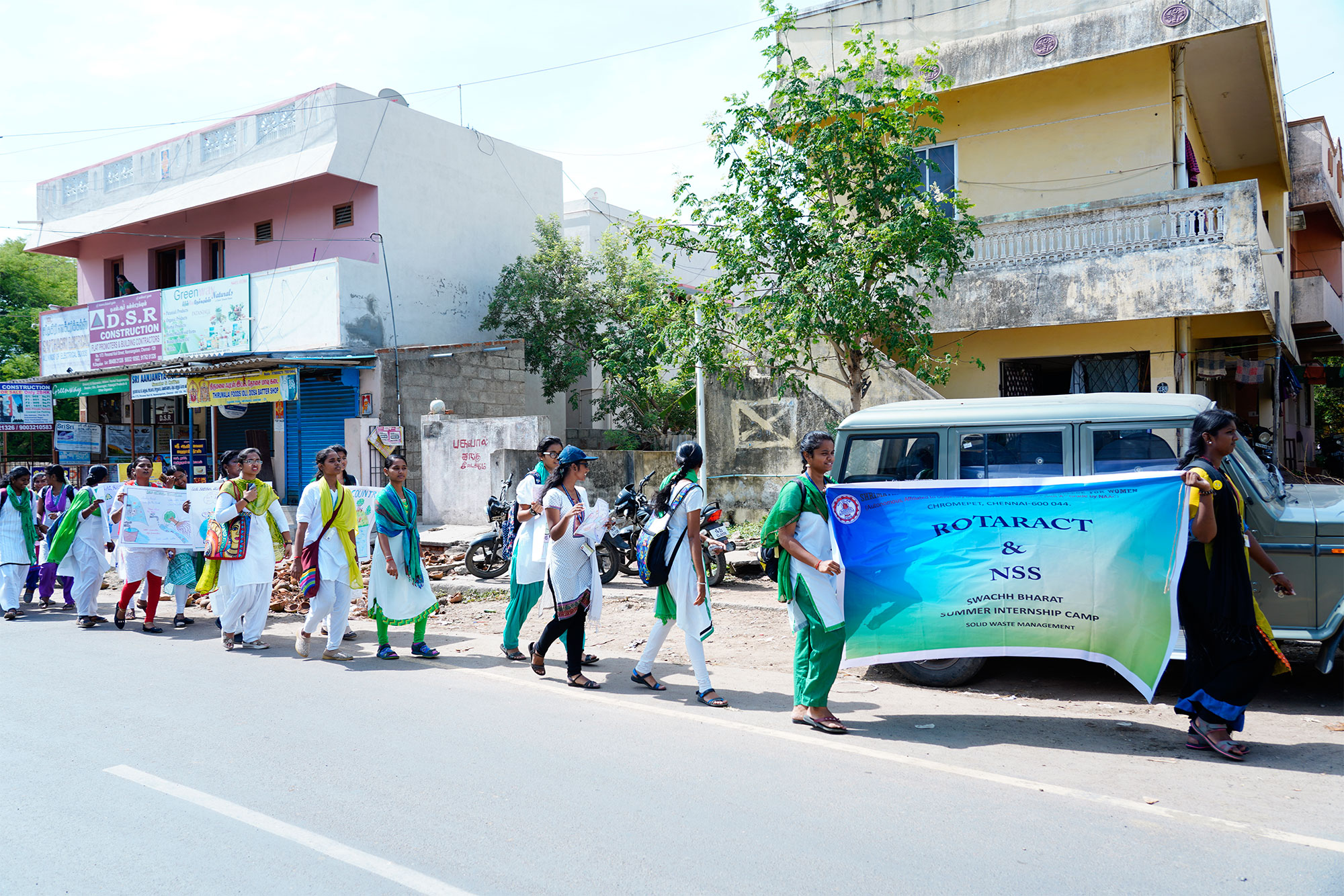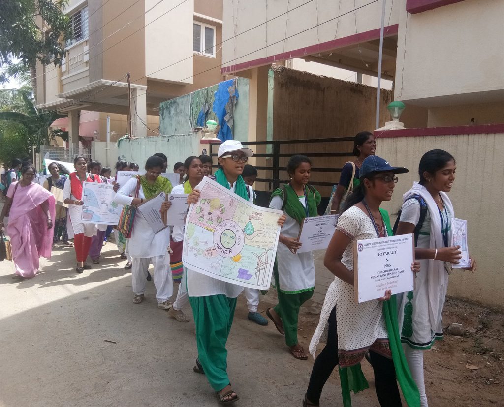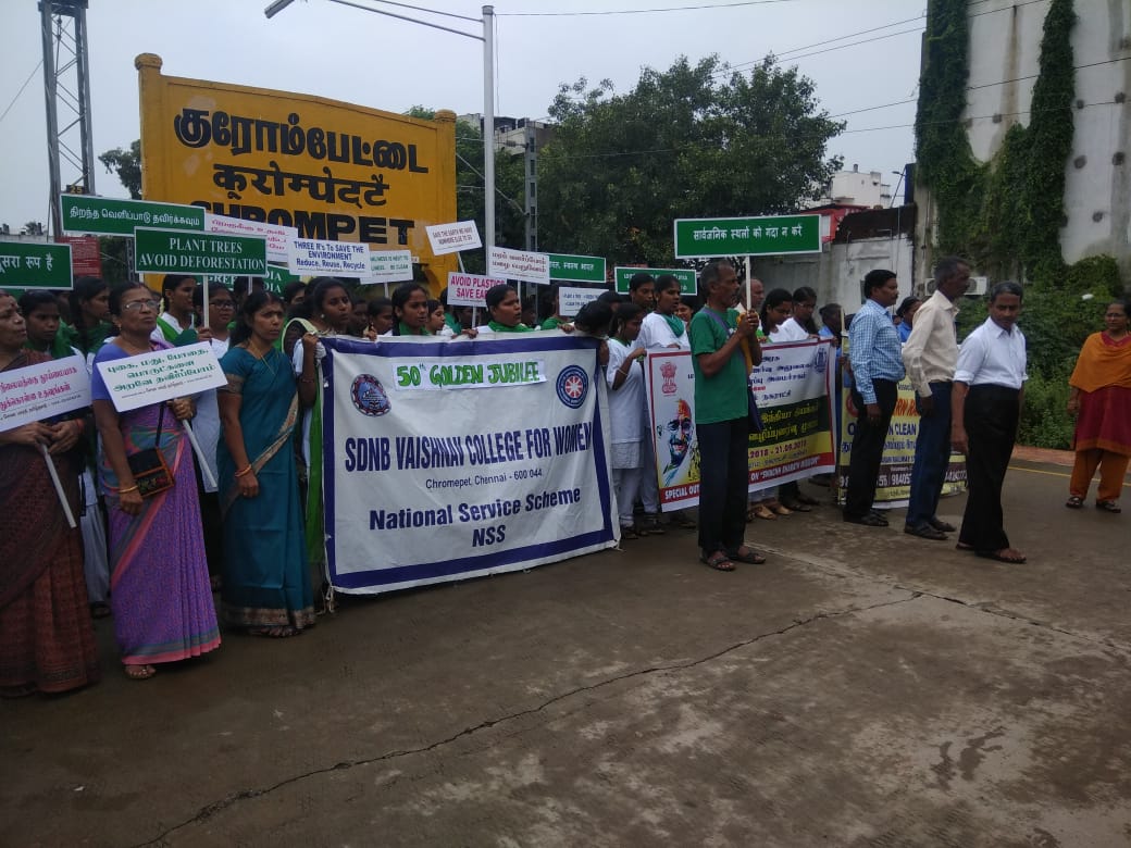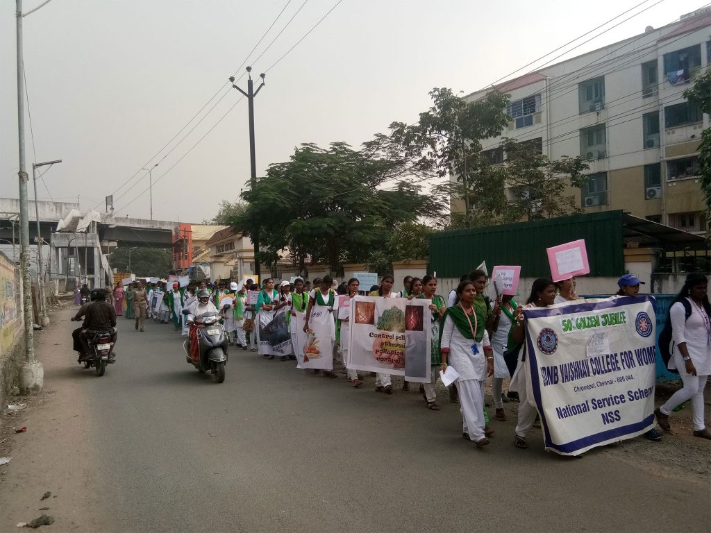The NSS volunteers prepared banner, slogan, pluck card, charts, drawings etc. Around 150 volunteers went on walk in the Chrompet streets yellingglobal warming, stop burning and measures to control pollution.