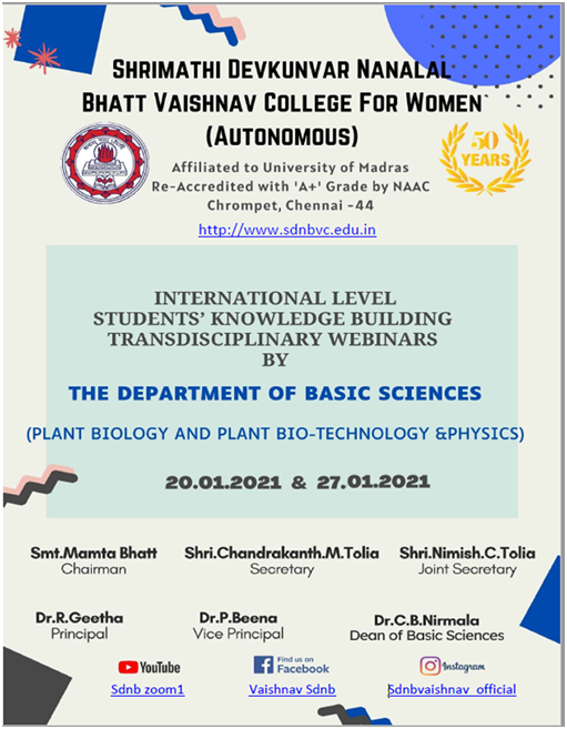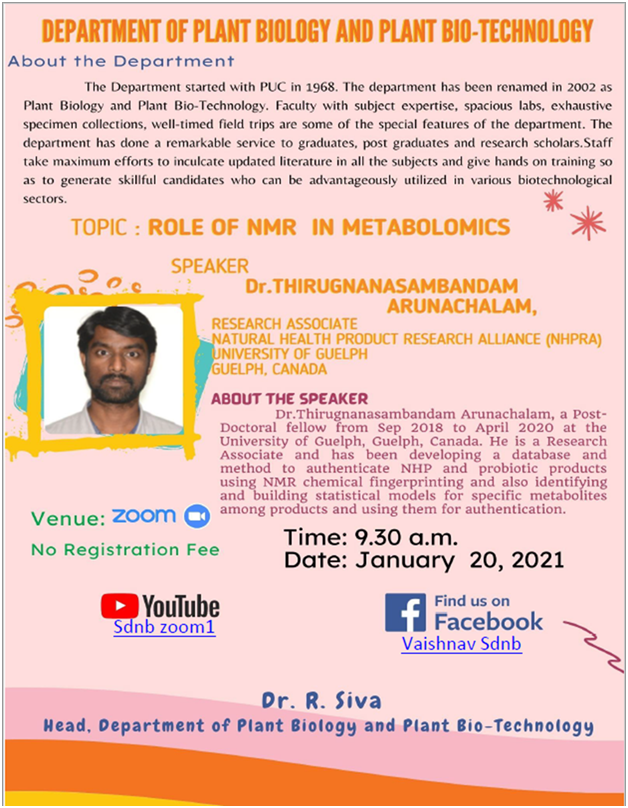 | 1. | 2020-2021 20/01/2021 | Role of NMR in Metabolomics | Dr. Thirugnanasambandam Arunachalam Research Associate Natural Health Product Research alliance University of Guelph Guelph, Canada |