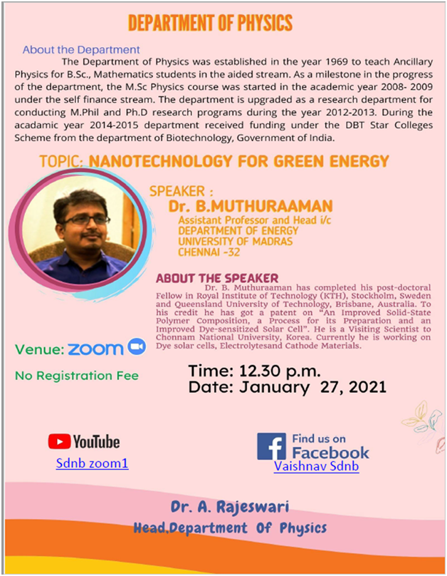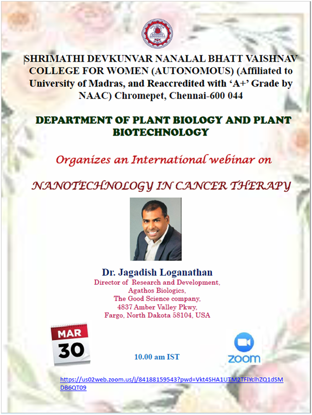 | 2. | 2021-2022 30/3/2022 | Nanotechnology in Cancer therapy | Dr. Jagadish Loganathan Director of Research and Development, Agathose Biologics, Fargo, North Dakota 58104, USA |