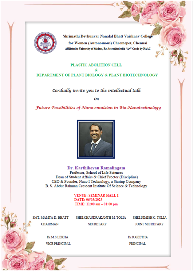 | 3. | 2021-2022 6/03/2023 | Future possibilities of Nano emulsion in Bio-Nanotechnology | Dr. Karthikeyan Ramalingam Professor, School of Life sciences, B.S.Abdur Rahaman Cresent Institute of Science and Technology |