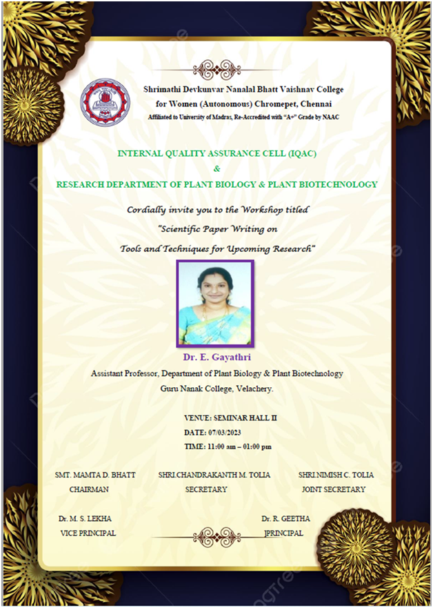 | 4. | 2021-2022 7/03/2023 | Scientific paper writing on tools and techniques for upcoming research | Dr. E. Gayathri Assistant Professor, Department of Plant Biology and Plant Biotechnology Guru Nanak College, Velachery |