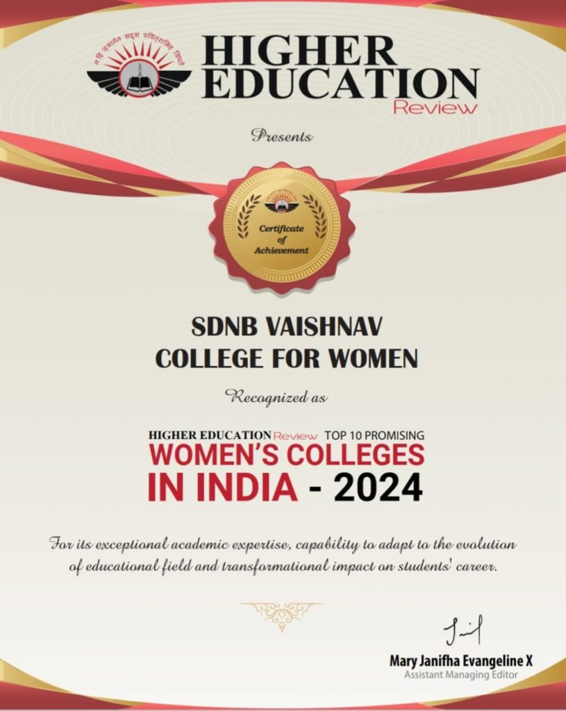 Our college has been recognized as one of the TOP 10 PROMISING WOMEN’S COLLEGES IN INDIA 2024 by Higher Education Review Magazine!
