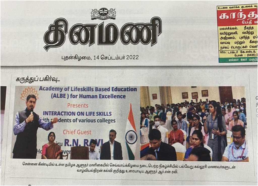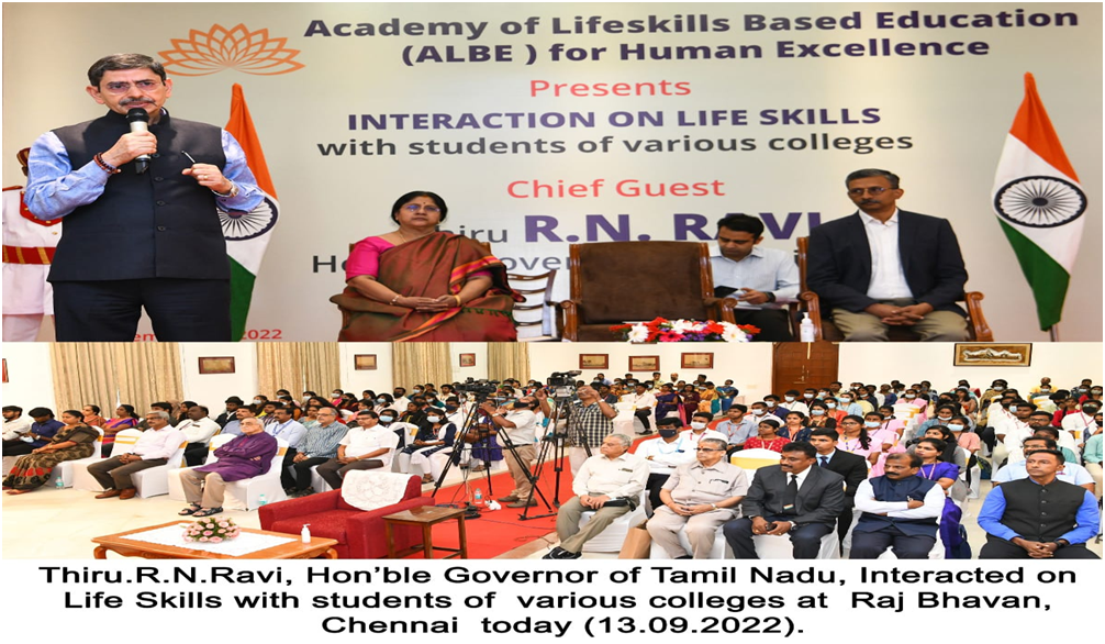 சென்னை கிண்டியில் உள்ள ஆளுநர் மாளிகையில் 13/09/2022 அன்று வாழ்வியல்திறன் கல்வி குறித்து மாண்புமிகு  தமிழக ஆளுநர் ஆர் .என்.ரவி அவர்கள் பல்வேறு கல்லூரி மாணவர்களுடன் விவேகானந்தரைப் பற்றி கருத்துப் பகிர்வு நிகழ்த்தினார்.