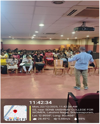 The resource person provided in-depth insights into AI-driven content ideation, platform-specific content strategies, and the growing opportunities for earning income through various digital platforms such as social media channels, content marketplaces, and freelancing ecosystems. Emphasis was placed on understanding audience behaviour, algorithmic visibility, branding, and consistency in content creation. Despite the constraints, the session remained highly engaging, with students actively participating through questions and discussions.