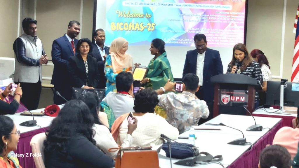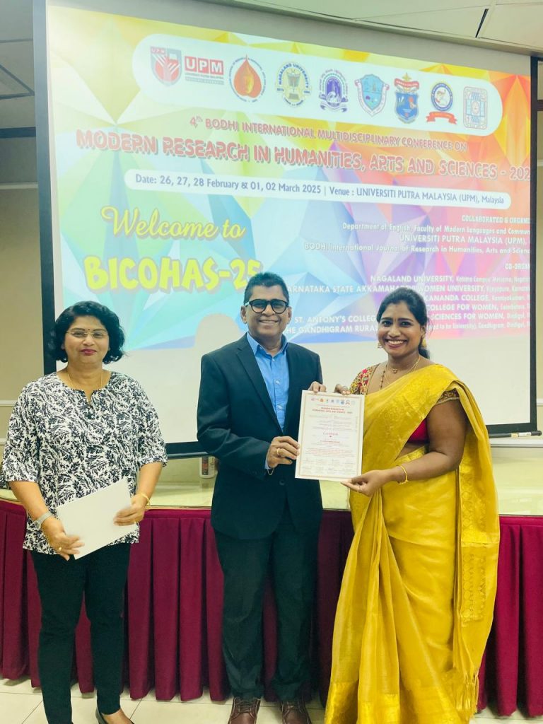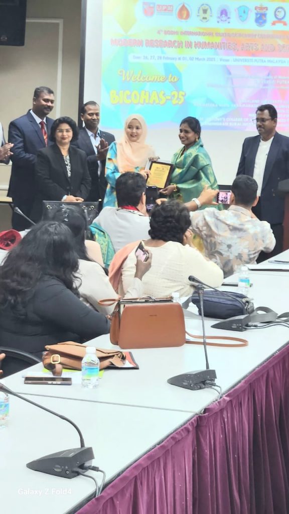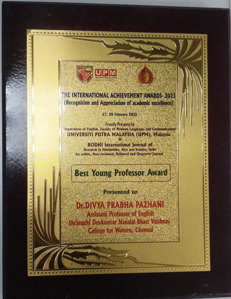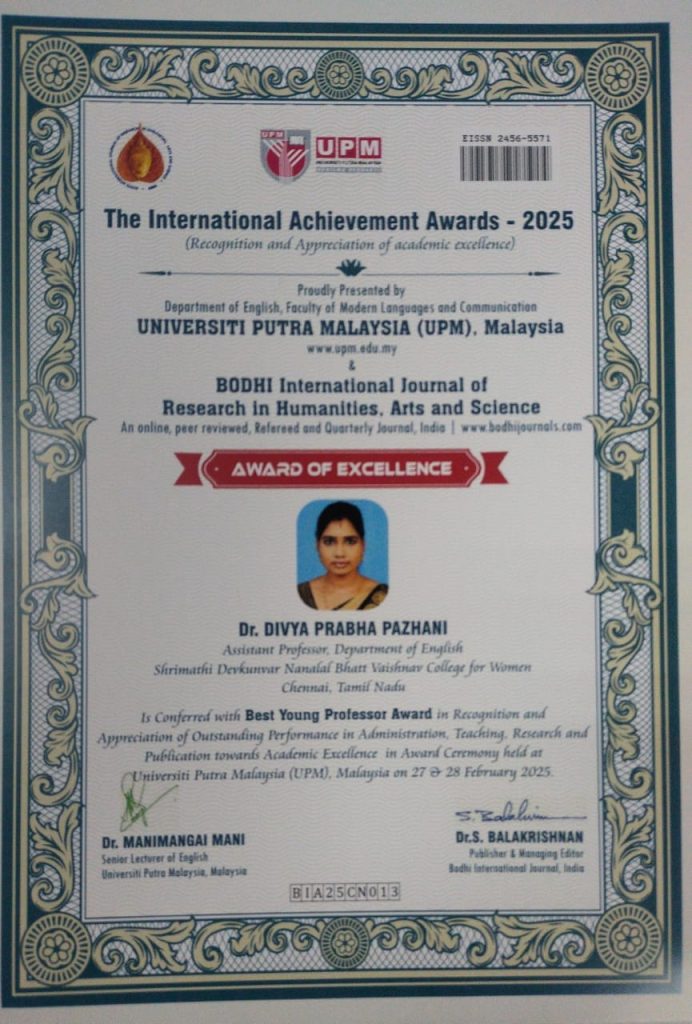 Dr. Divya Prabha.P, from the Department of English (Aided) has been conferred with ” Best Young Professor Award” by the Department of English, Faculty of Modern Languages and Communication, University of Putra, Malaysia in collaboration with Bodhi International Journal of Research in Humanities, Arts and Science, in an International Conference organised in the University Campus, Malaysia on 28th February 2025. This International award was presented in recognition and appreciation for her outstanding performance in Administration, Teaching, Research and Publication.