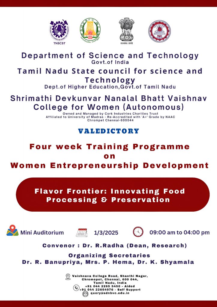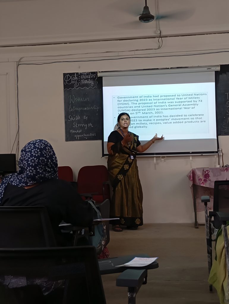 The Women Entrepreneurship Development Programme was successfully conducted at our college premises with the support and funding from the Department of Science and Technology, Government of India, and the Tamil Nadu State Council for Science and Technology. The programme aimed to empower women by providing hands-on training in entrepreneurial activities such as mushroom cultivation, millet production, and cake baking, fostering self-reliance and economic independence. Over 35 participants successfully completed the training, gaining awareness of small-scale business opportunities, with several showing interest in starting their own ventures. To encourage them, the college facilitated networking and collaboration opportunities by providing stalls for business growth. The programme featured notable speakers, including Mrs. Kamalika Krishmy, CEO of The Brown Box Company, and Mrs. Kadambari Umapathy, CEO of the Women Entrepreneurship Development Organisation (WEDO), who delivered insightful lectures. Additionally, participants received a free three-month membership in WEDO, further supporting their entrepreneurial journey. This initiative not only equipped women with essential skills but also motivated them to explore self-employment as a sustainable career option.